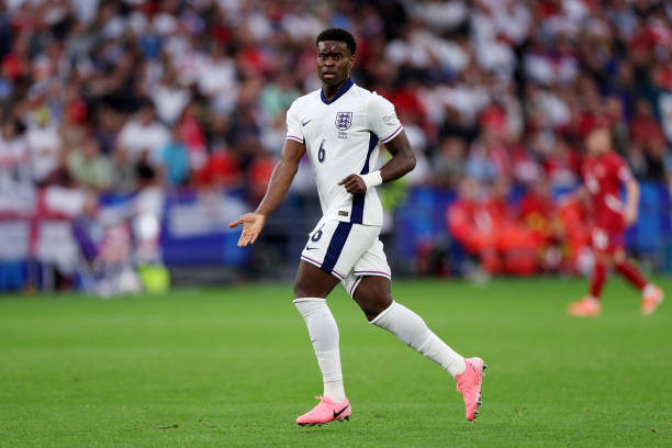 ISYARAT: Marc Guehi saat memberi isyarat pada pertandingan penyisihan grup UEFA EURO 2024 antara Serbia dan Inggris di Arena AufSchalke pada 16 Juni 2024. Foto: Dean Mouhtaropoulos/Getty Images--