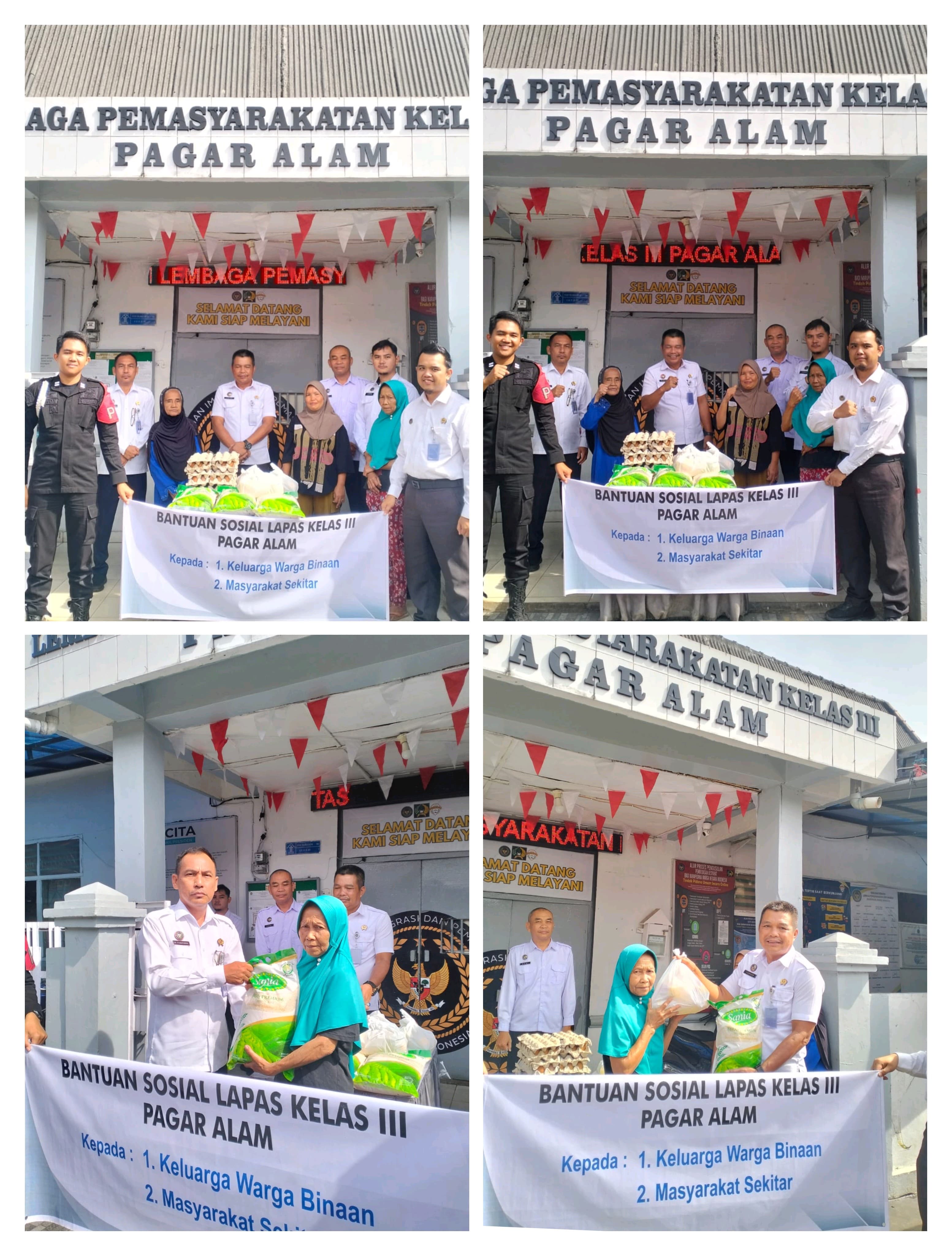Kegiatan dimulai pukul 09.00 WIB hingga selesai, bertempat di lingkungan Lapas Kelas III Pagar Alam. Bantuan sosial yang disalurkan berupa tiga paket sembako, masing-masing berisi 5 kg beras, satu karpet telur, 1 liter minyak goreng, 1 kg gula, dan satu bungkus mie instan, yang diberikan kepada tiga warga kurang mampu di sekitar area lapas.