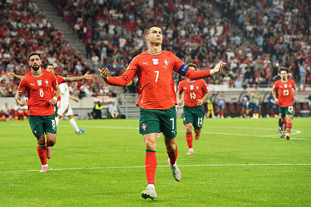 GOL: Cristiano Ronaldo usai mencetak gol dan merayakannya di pertandingan kualifikasi Piala Dunia FIFA 2026 antara Hongaria dan Portugal di Puskas Arena pada 9 September 2025 di Budapest, Hongaria. Foto: Alexandra Fechete/MB Media/Getty Images--
