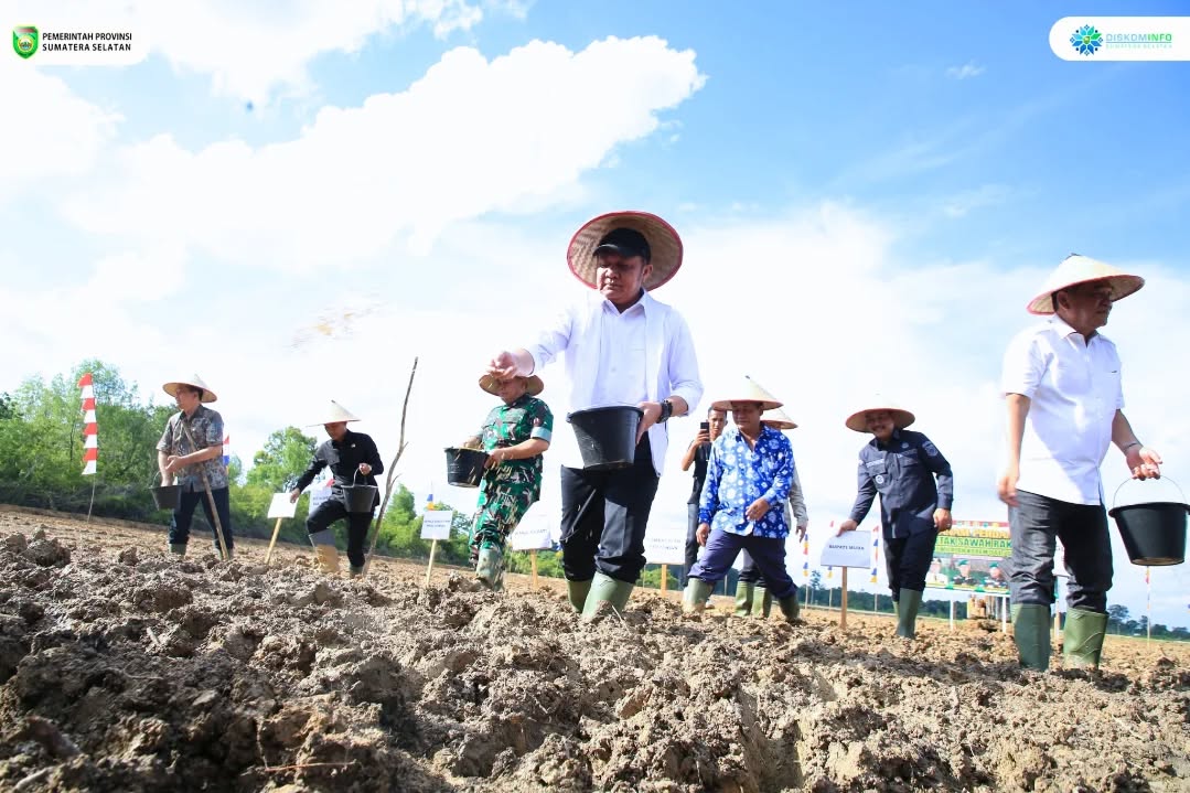 PERDANA: Gubernur Sumsel, H Herman Deru (HD), bersama Pangda II/Sriwijaya dan jajaran Forkopimda lainnya, melaksanakan tanam perdana cetak sawah rakyat di wilayah Korem 044/Gapo, Desa Lumpatan, Kabupaten Musi Banyuasin (Muba), Minggu (30/11/2025). Foto: H--